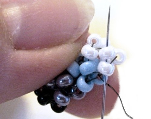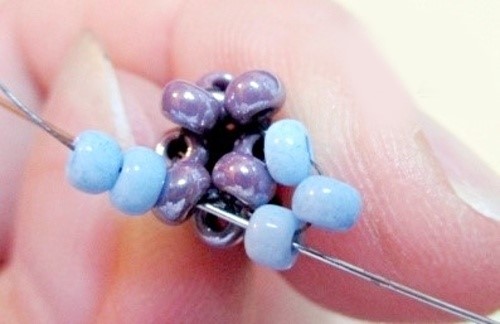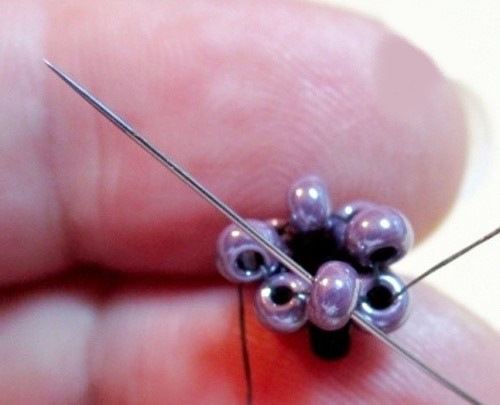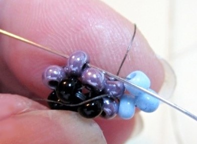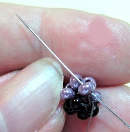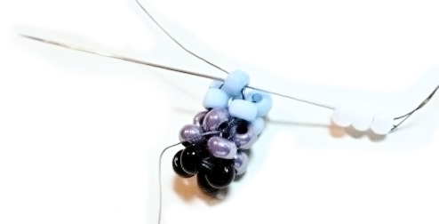 Navlékněte 4x R8. Prošijte je znovu od prvního navlečeného korálku a Nit vychází z R8 černé a naberte 3x R8 fialovou.