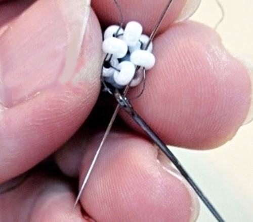Prošijte znovu očko ktelovací jehly a bílý R8. Naberte 3xR8 černý a prošijte bílý R8. Prošijte vedlejší bílý R8.
