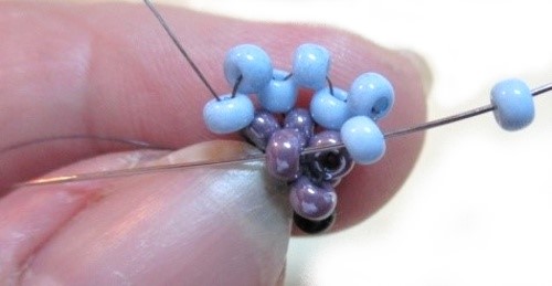 Naberte 3x R8 modrý a prošijte fialový R8 z druhé strany než Prošijte vedlejší fialový R8. Navlékněte 2xR8 modrý. Prošijte modrý a fialový R8 pole obrázku.