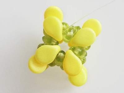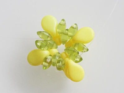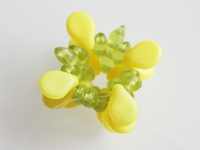 Navlékněte střídavě 4xT a 4xP. Svažte dvojitým uzlem do kroužku. Nechte si cca 8 cm dlouhý konec vlasce na zapošití.