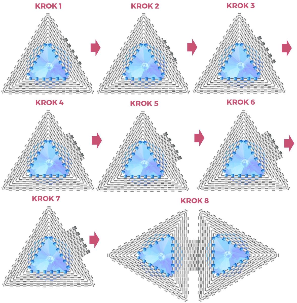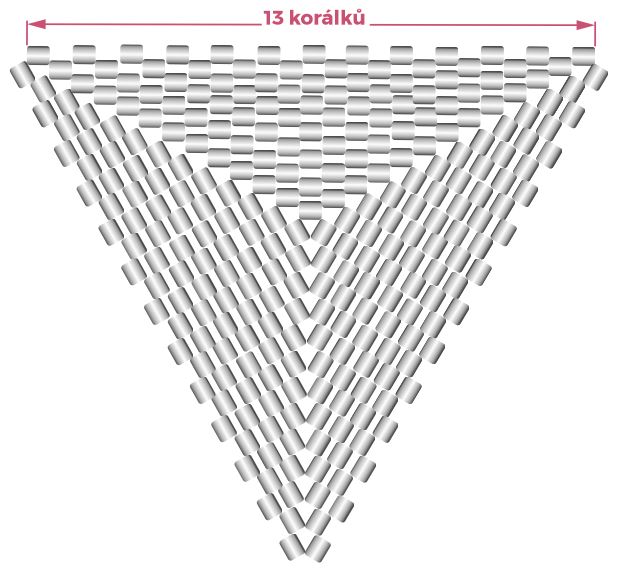 KROK 2 až 7 - u každé další řady přidáváte korálky stejně, jako tomu bylo u spodní části trojúhelníku, až se dostanete opět na počet 13 korálků v řadě (KROK 7)