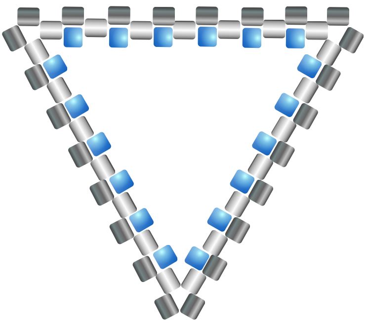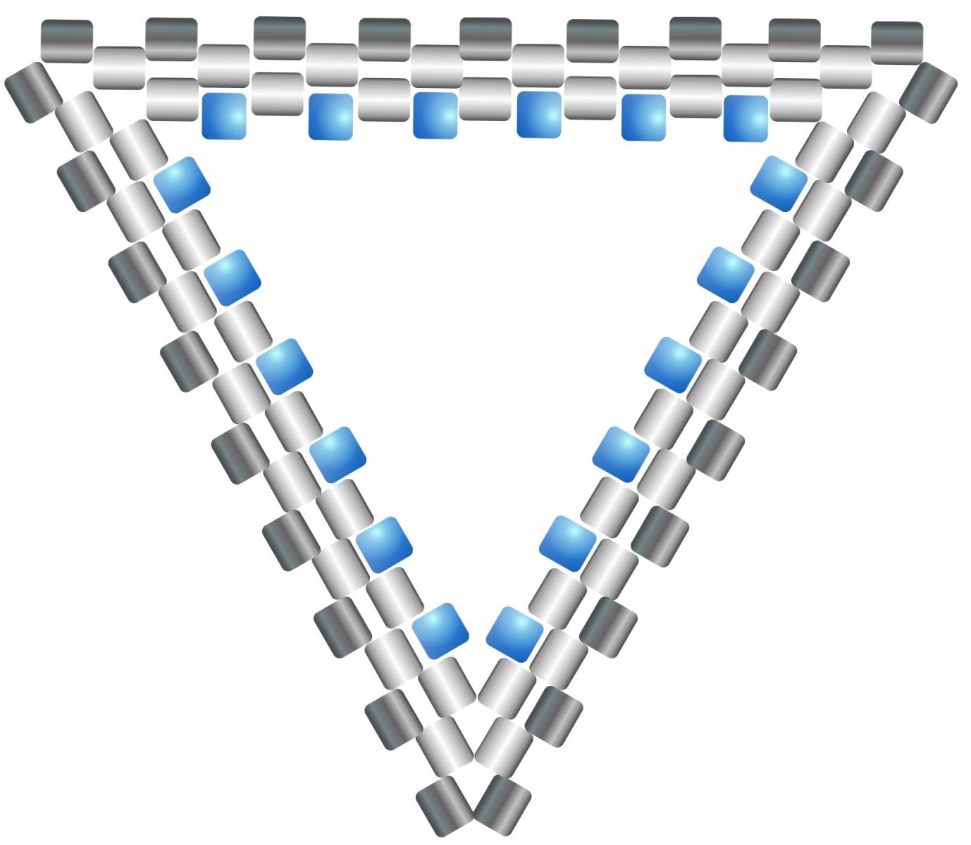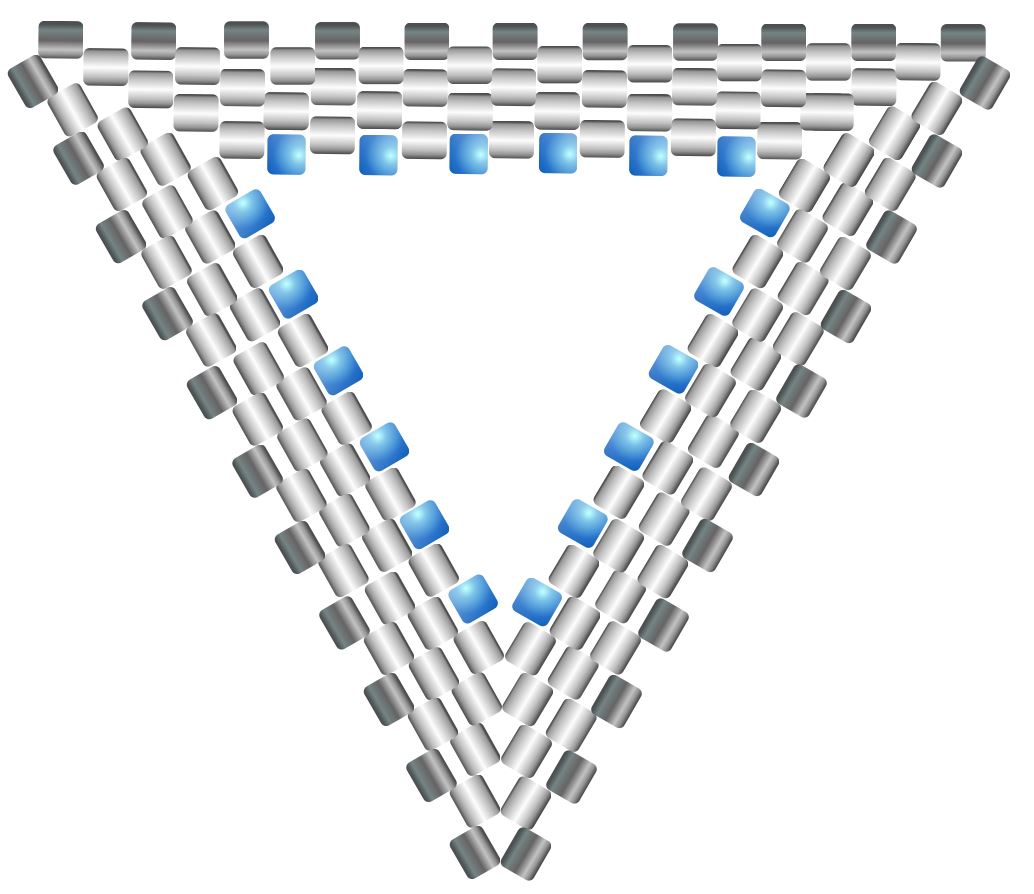 Krok 5 a 6 opakujte stále dokola do požadované velikosti trojúhelníku. Uvidíte, jak se pěkně začal tvořit trojúhelník, postup v rozích je stále stejný (korálky vždy srovnejte tak, aby na sebe pěkně dosedly ve tvaru, jaký je na obrázku). Na stranách trojúhelníku se všívá po jednom korálku a v každé následující řadě je jich o jeden více.