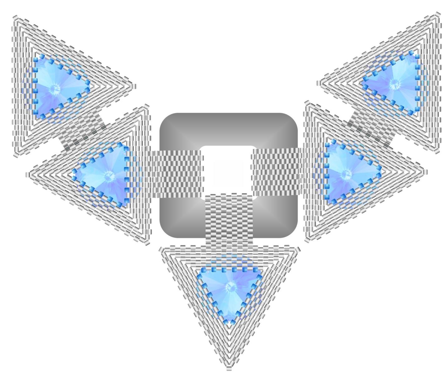 KROK 1 - Udělejte základní návlek přesně podle nákresu (pozor na zdvojené šedé korálky - ty budou tvořit rohy trojúhelníku), spojte korálky do kroužku, buď opětovným prošitím (znovu všechny korálky prošijete ještě jednou od prvního, kterým jste začínali a po stažení se vytvoří kruh) anebo svázáním na uzel, jak to komu vyhovuje. Nechte si delší volný konec nitě, aby se dal dobře zapošít.