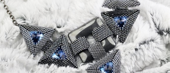 Do rohů vnějších trojúhelníků připevníte řetízek pomocí ketlovacích kleští. Délku řetízku je nutné přizpůsobit podle síly krku nositelky, v našem případě je délka řetízku na každé straně 18 cm.