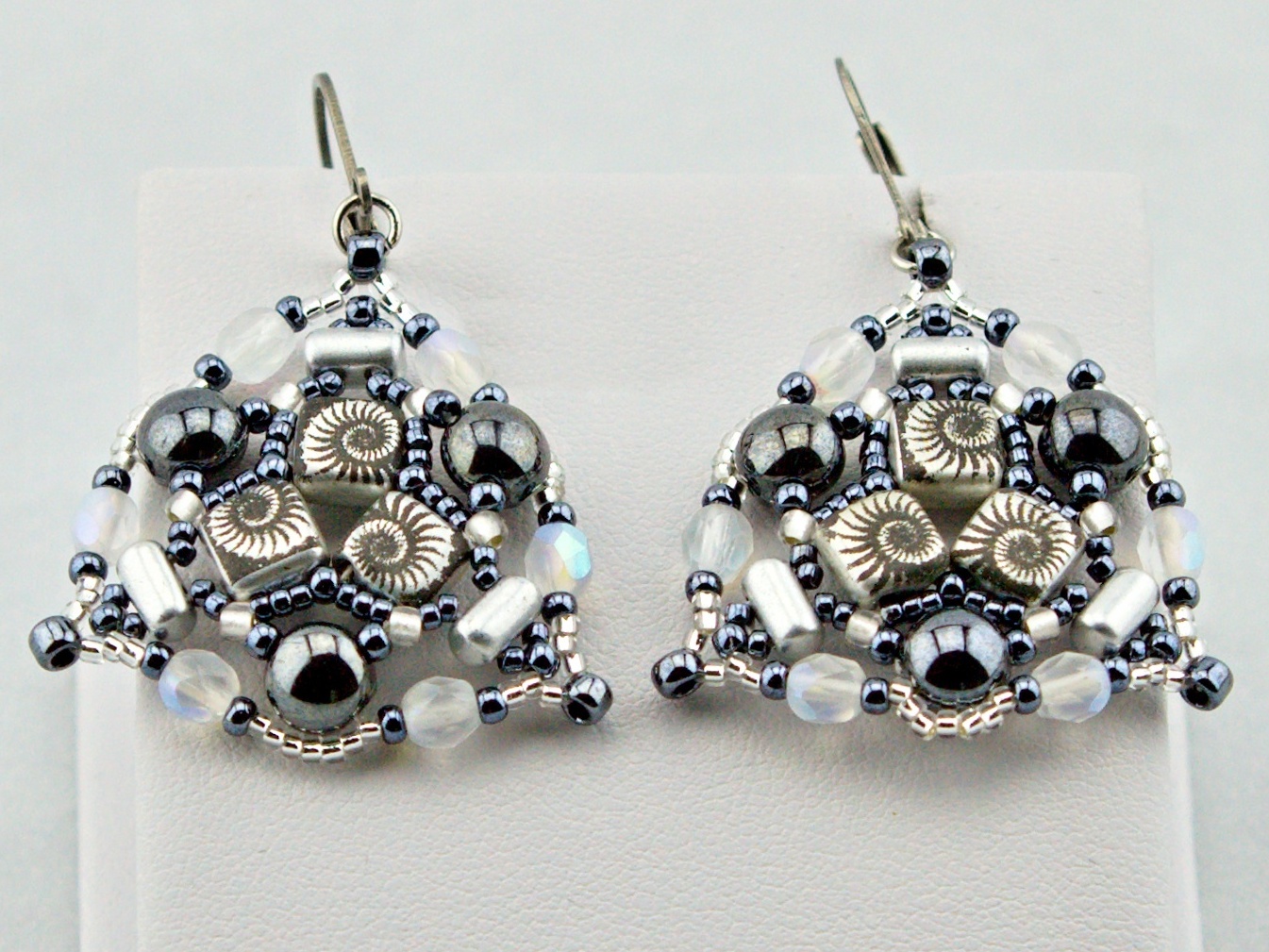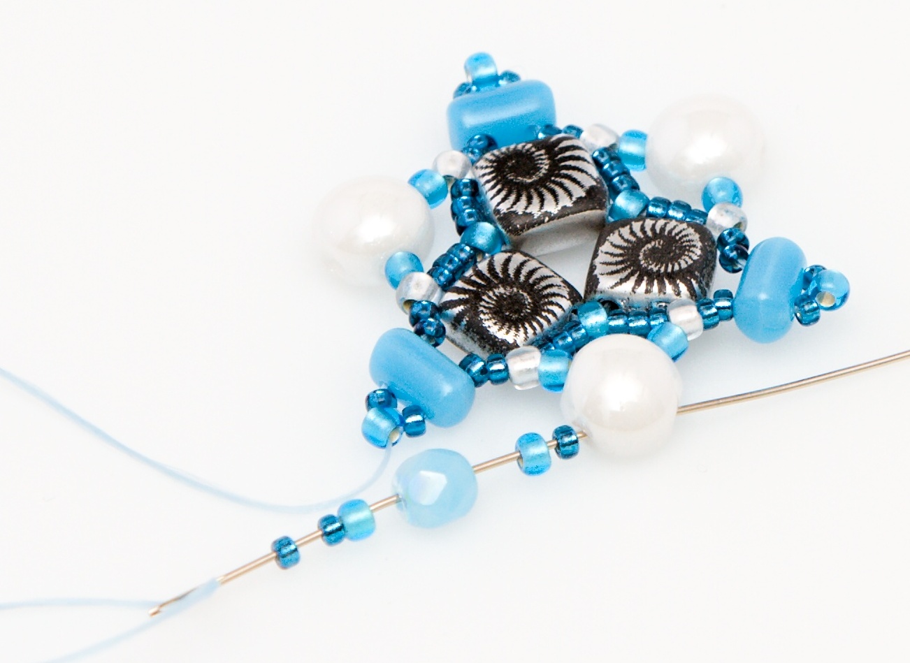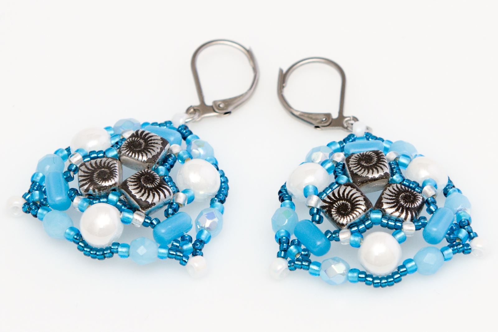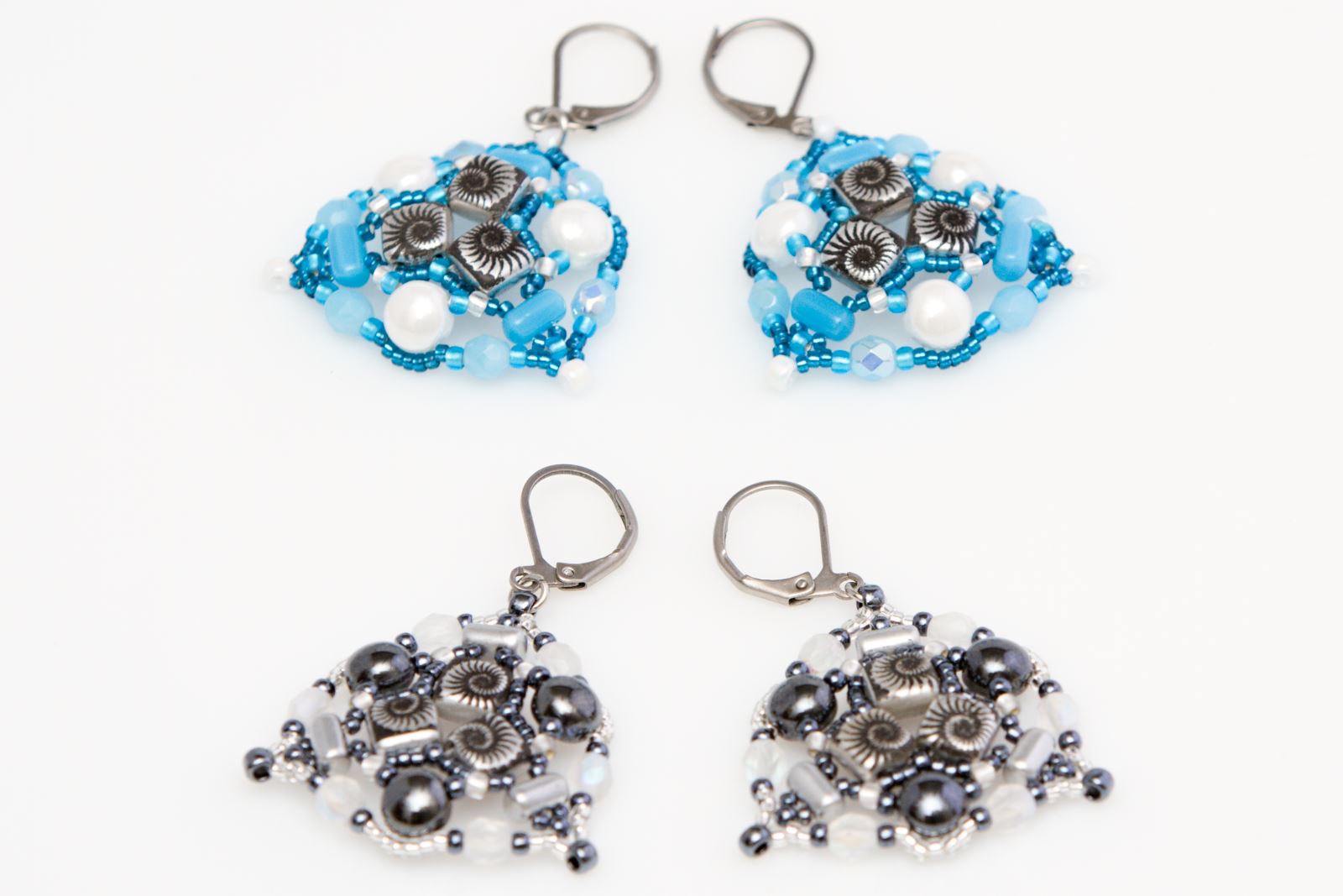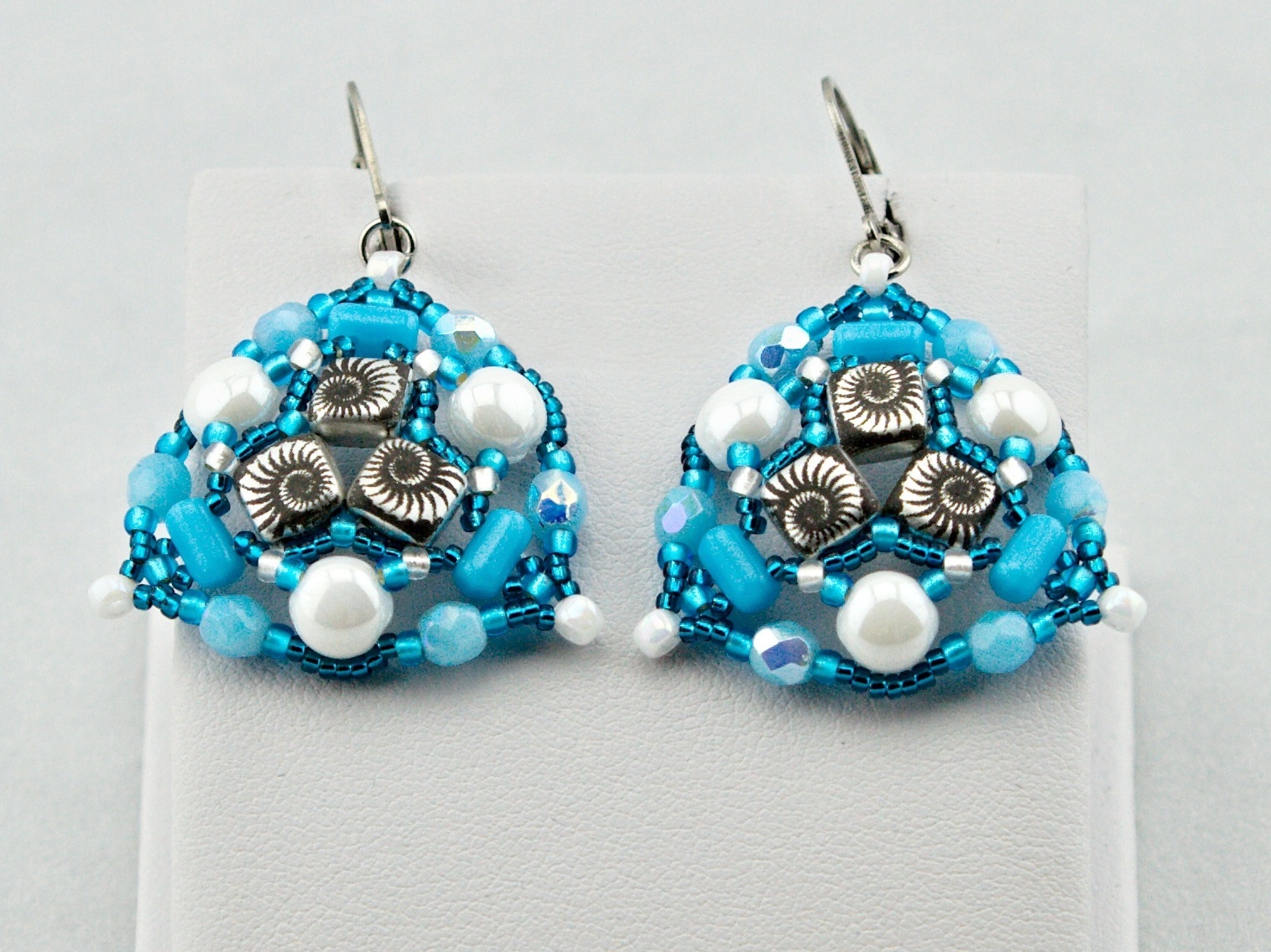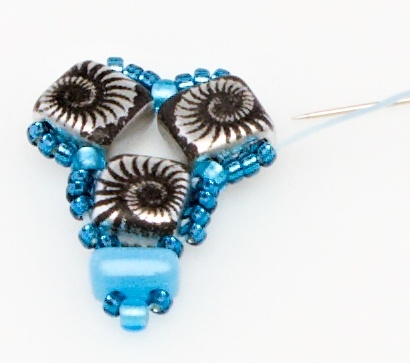 Vše prošijte ještě jednou pro zpevnění. Při prošívání vynechte R8, korálek vyskočí a udělá hezkou špičku. Do R8 připojte přes spojovací kroužek náušnicové zapínání.