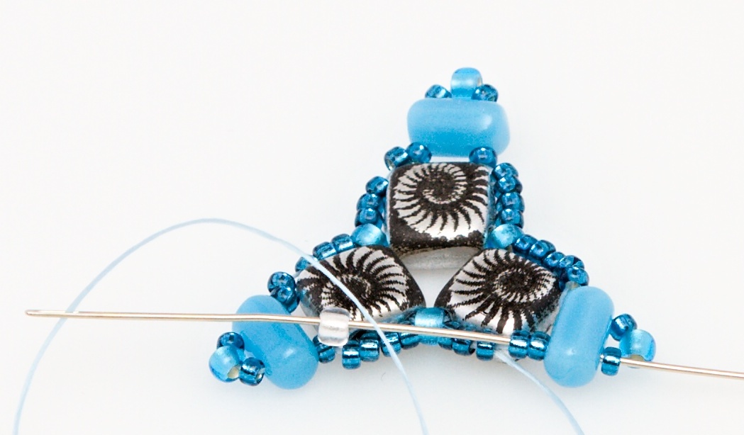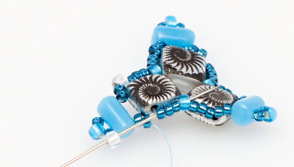 Nit vychází z C. Naberte R15+R11+O+R11+2xR15 a prošijte R11 podle obrázku. Krok 9 a 10 opakujte ještě 2x.