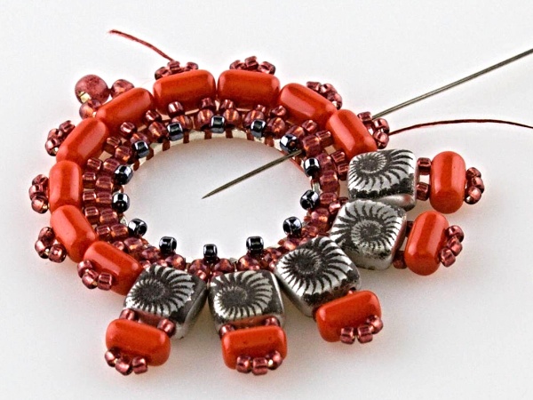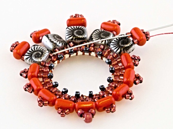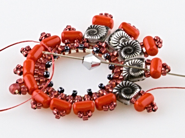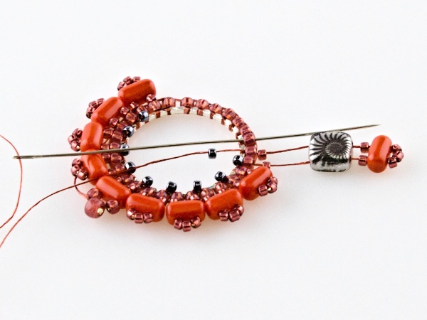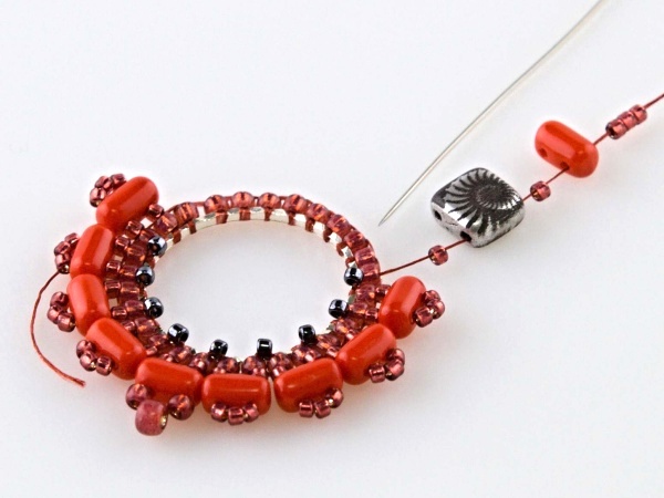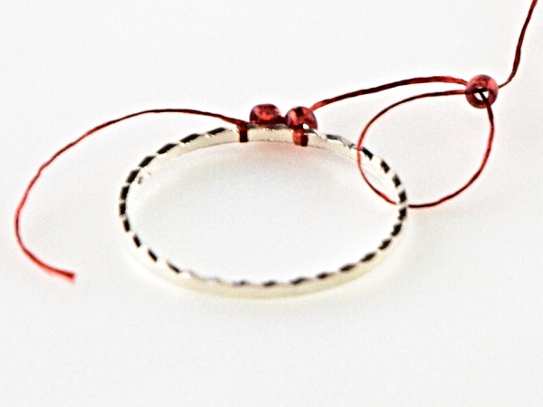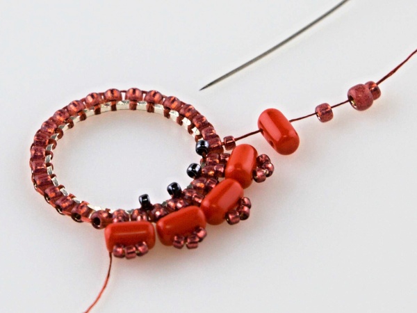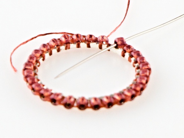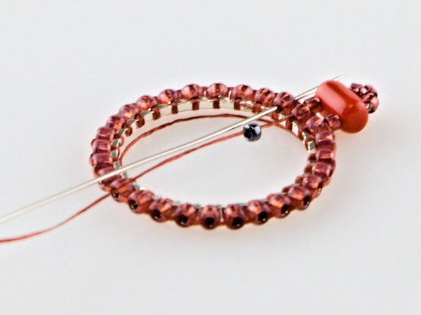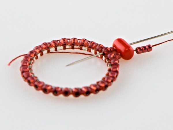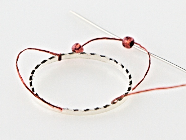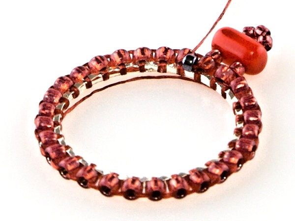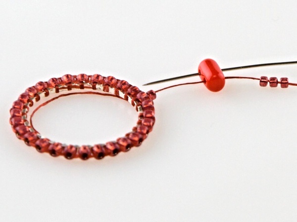 Na kroužek přivažte nit udělejte uzlík, navlečte 2x R11, jehlou projeďte vnitřkem kroužku a vyjeďte druhým R11 zespoda.