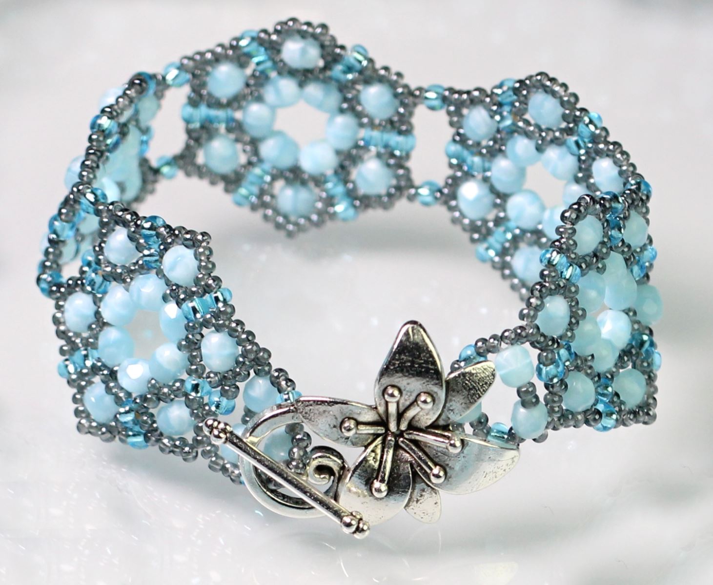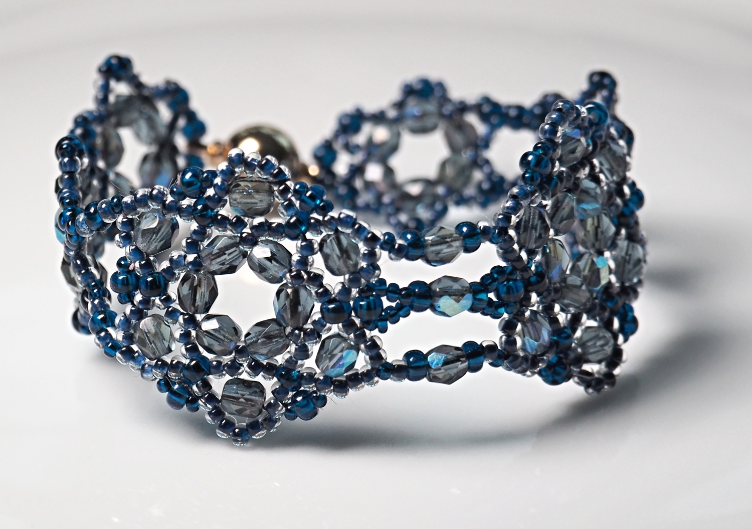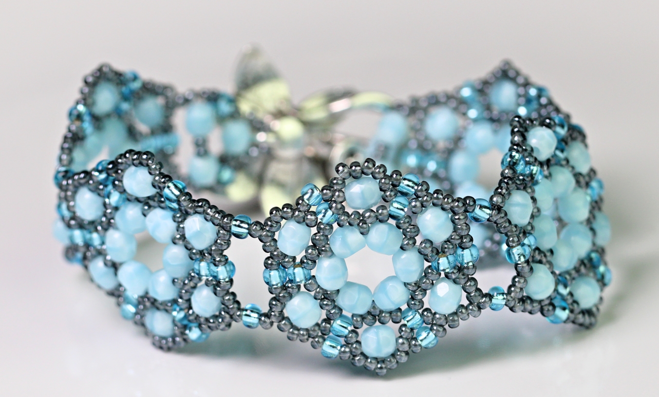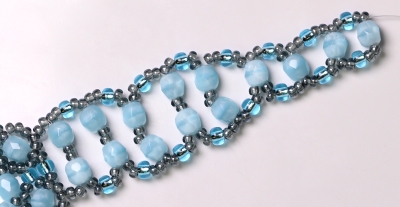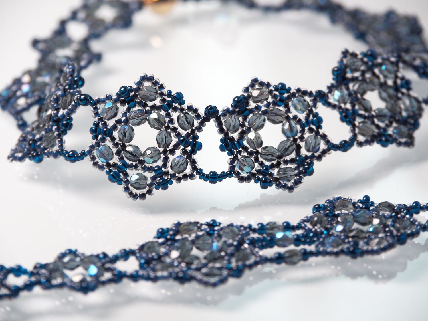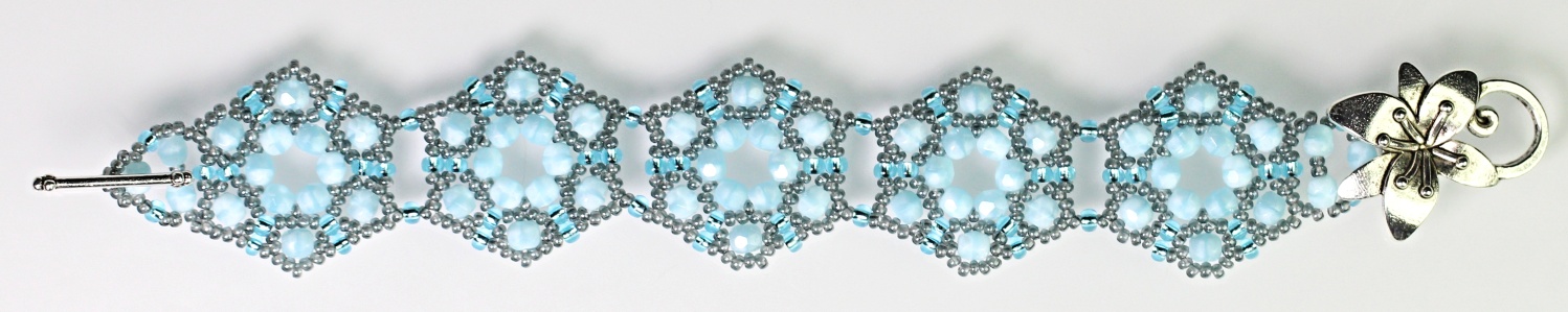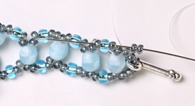 Náramek udělejte z pěti jednotek spojených přes 1xR11 + 1xR8 + 1xR11. Zapínání přišijte stejným způsobem jako na náhrdelníku.
