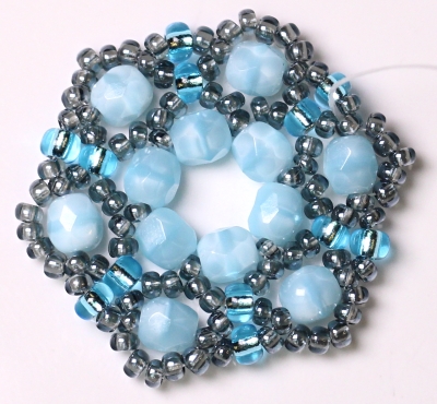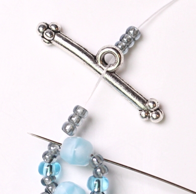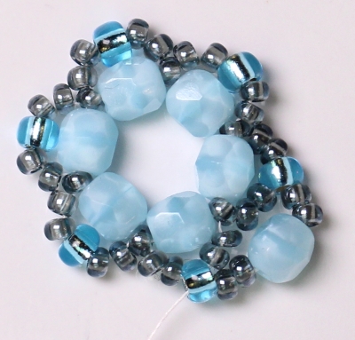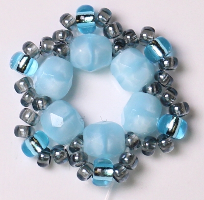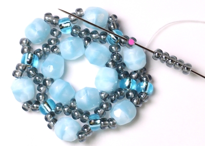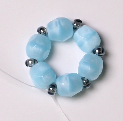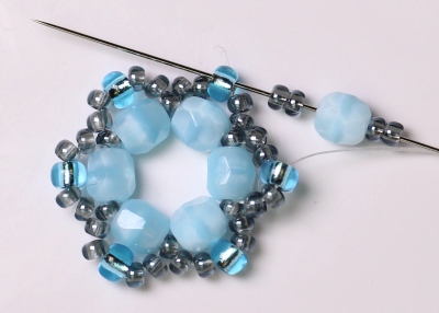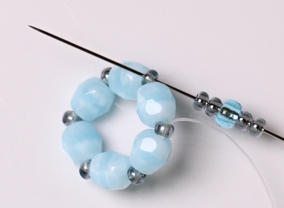 Navlékněte střídavě 6x BP a R11/0. Prošijte je znovu od prvního navlečeného korálku a kroužek pěkně svažte. Nit vychází z R11/0.