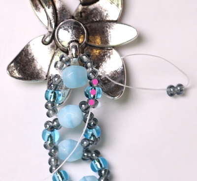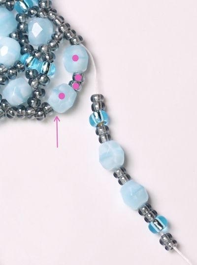 Přišijte poslední jednotku přes 2x 11/0 + BP + 2x 11/0 dle obrázku. Prošijte vše 2x.