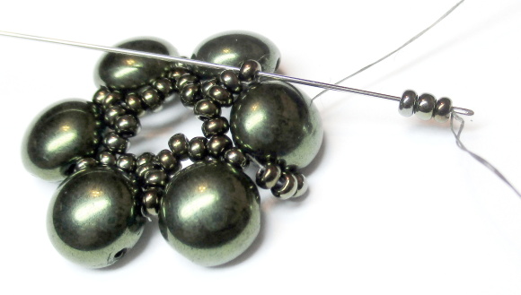Navlékněte 4xR11 a jehlu provlékněte dalším následujícím korálkem R11 po obvodu věnečku .