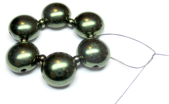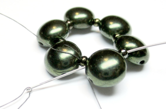 Máte ušitý první dílek- věneček. Podle výše popsaného postupu ušijte další věneček, po došití ale návlek neukončujte, jehlu prošijte korálky tak, jak je znázorněno na fotografii,
