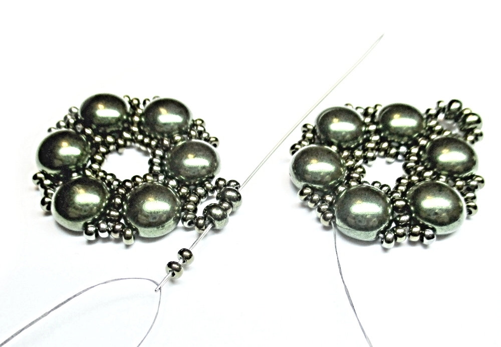 Krok 5 a 6 opakujte po celém obvodu věnečku, Jen nad posledním korálkem C ušijete oblouček ze 3 korálků R11 a jehlu vpíchněte do prvního korálku prvního ušitého obloučku.