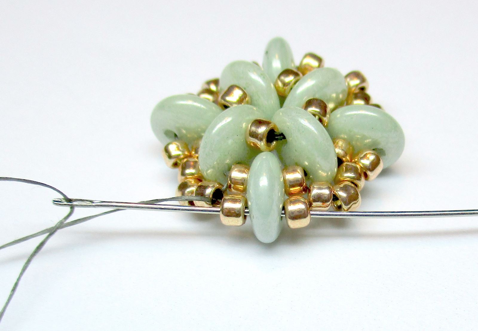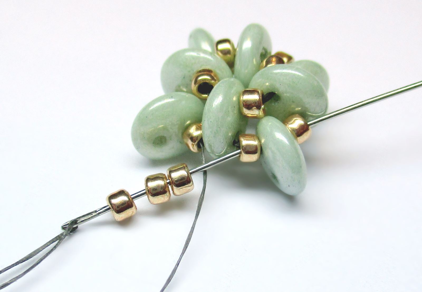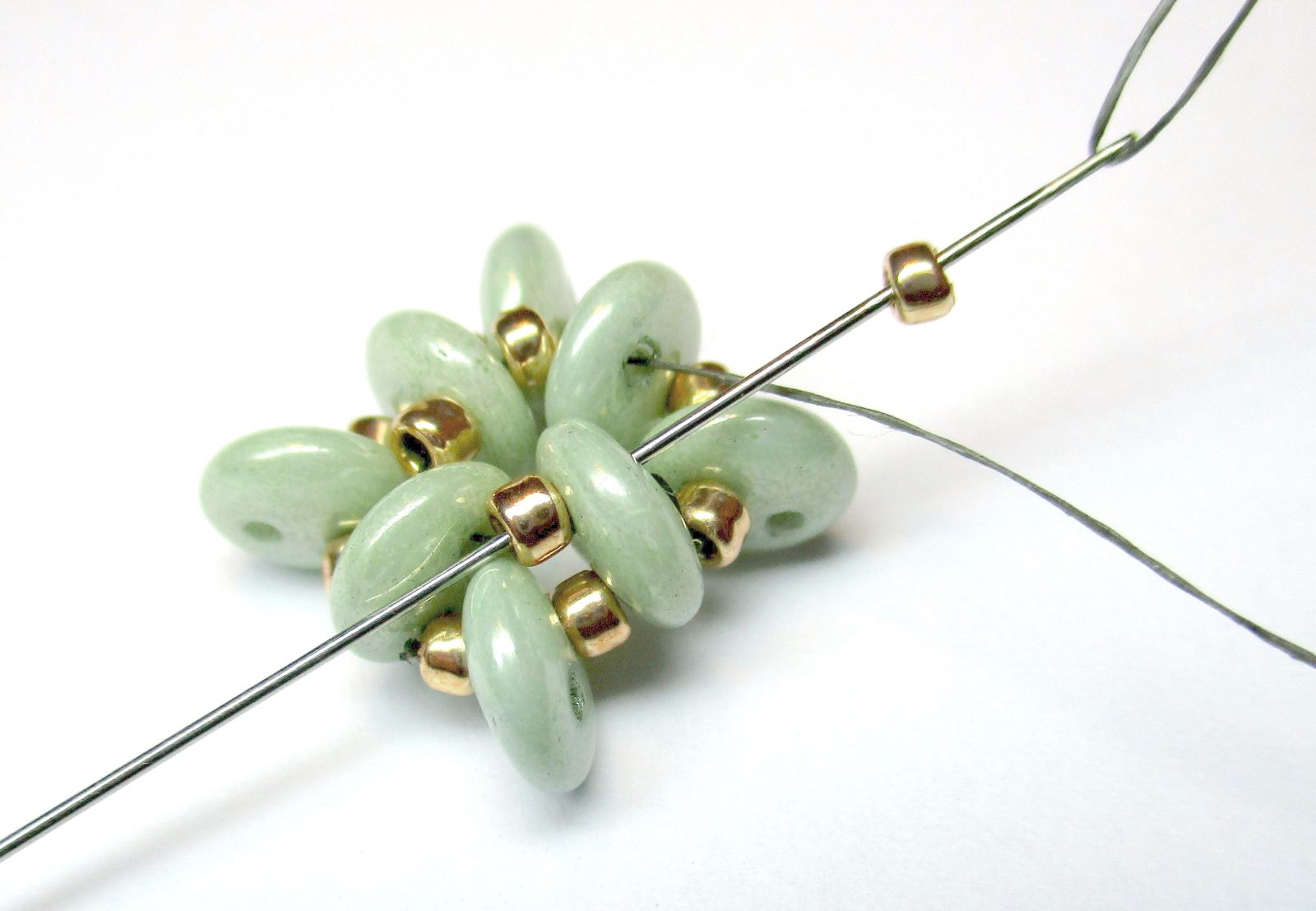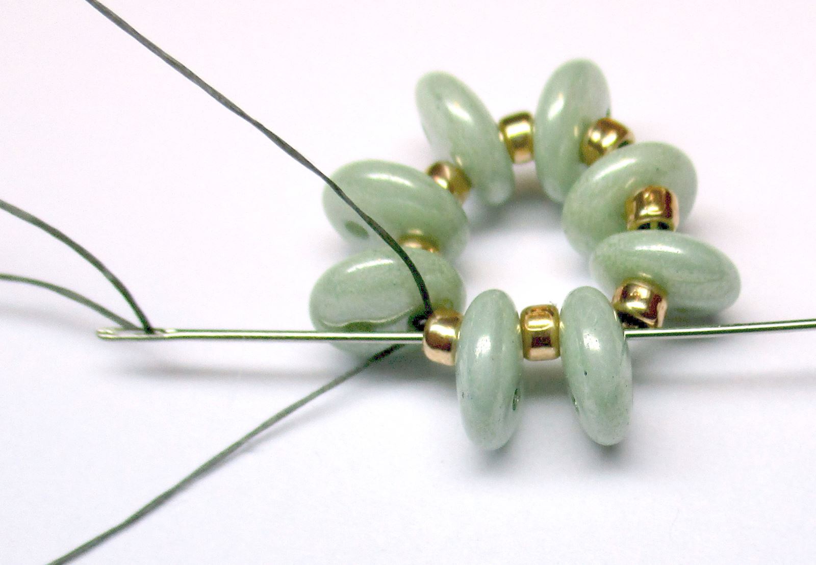 Fädeln Sie die Nadel wie auf dem Foto gezeigt durch die Perlen.