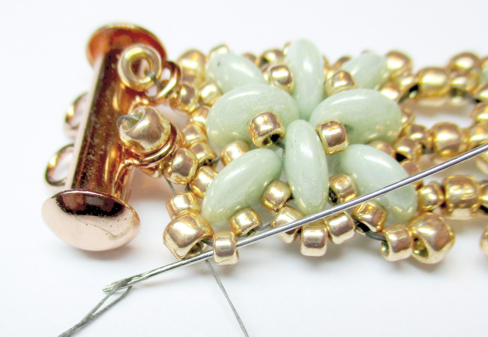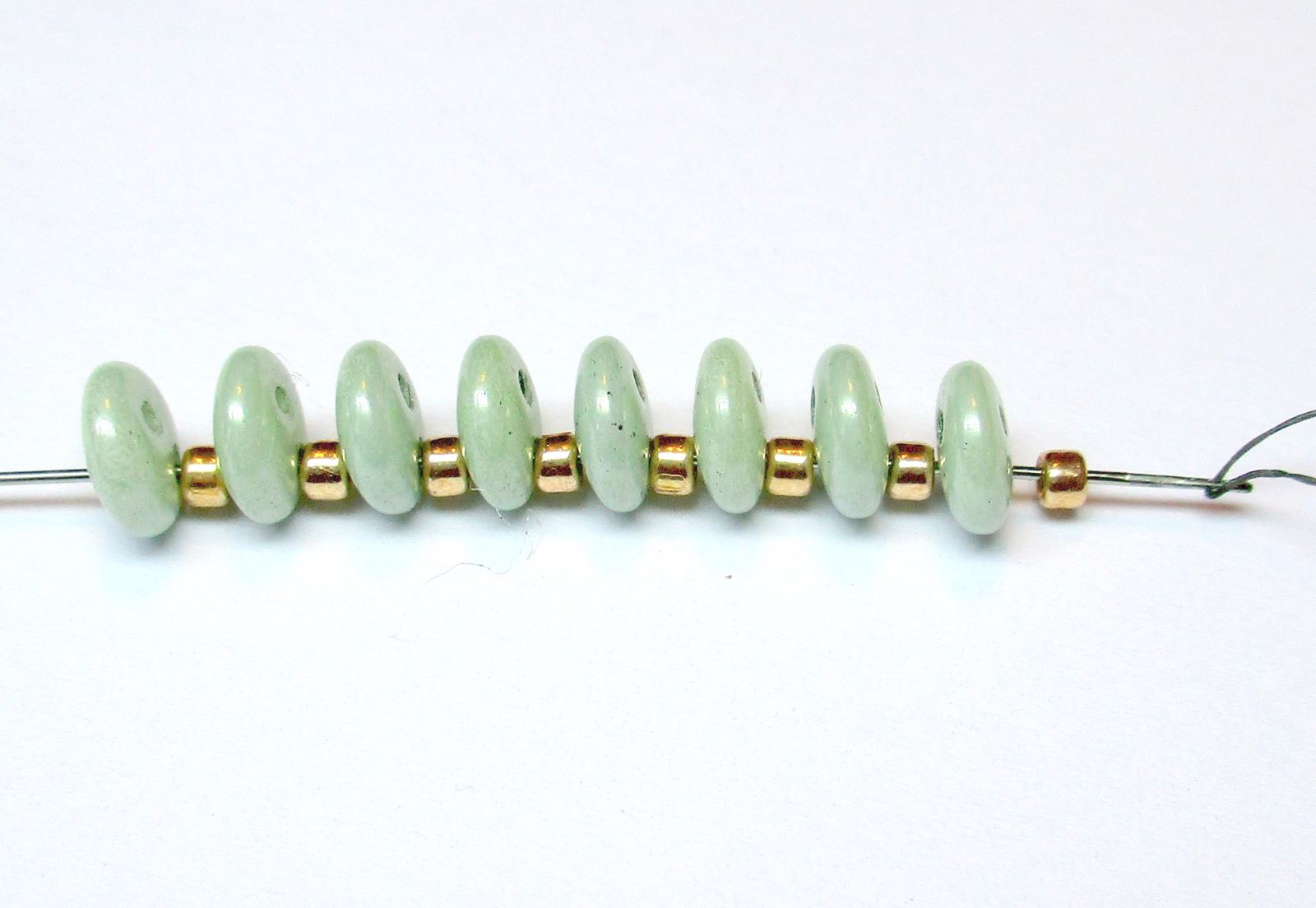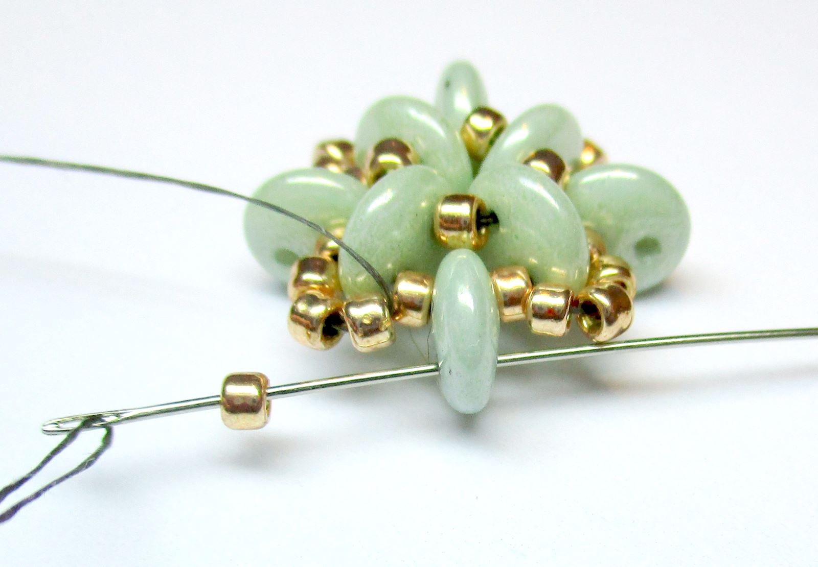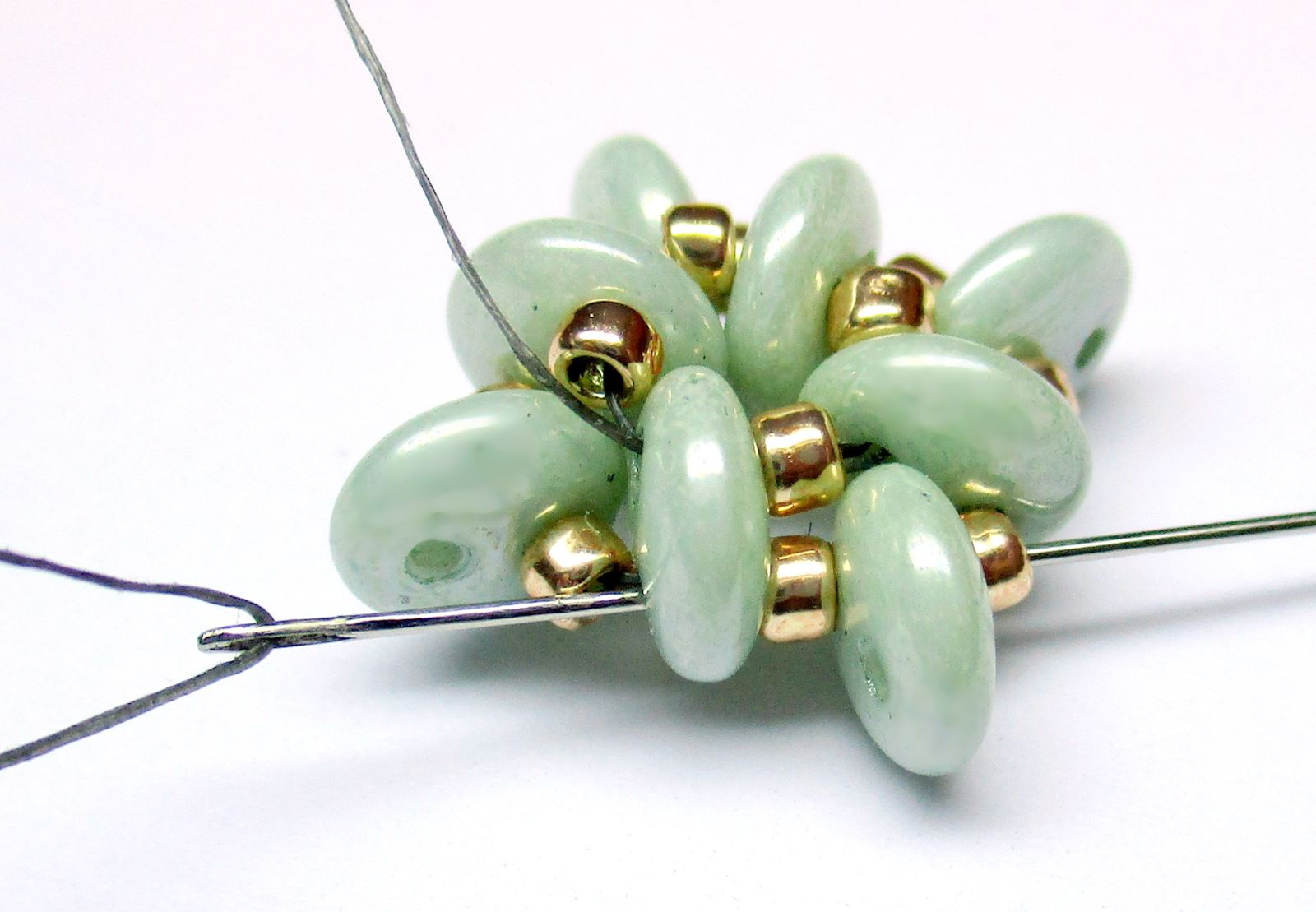 Fädeln Sie die Nadel wie auf dem Foto gezeigt durch die Perlen.