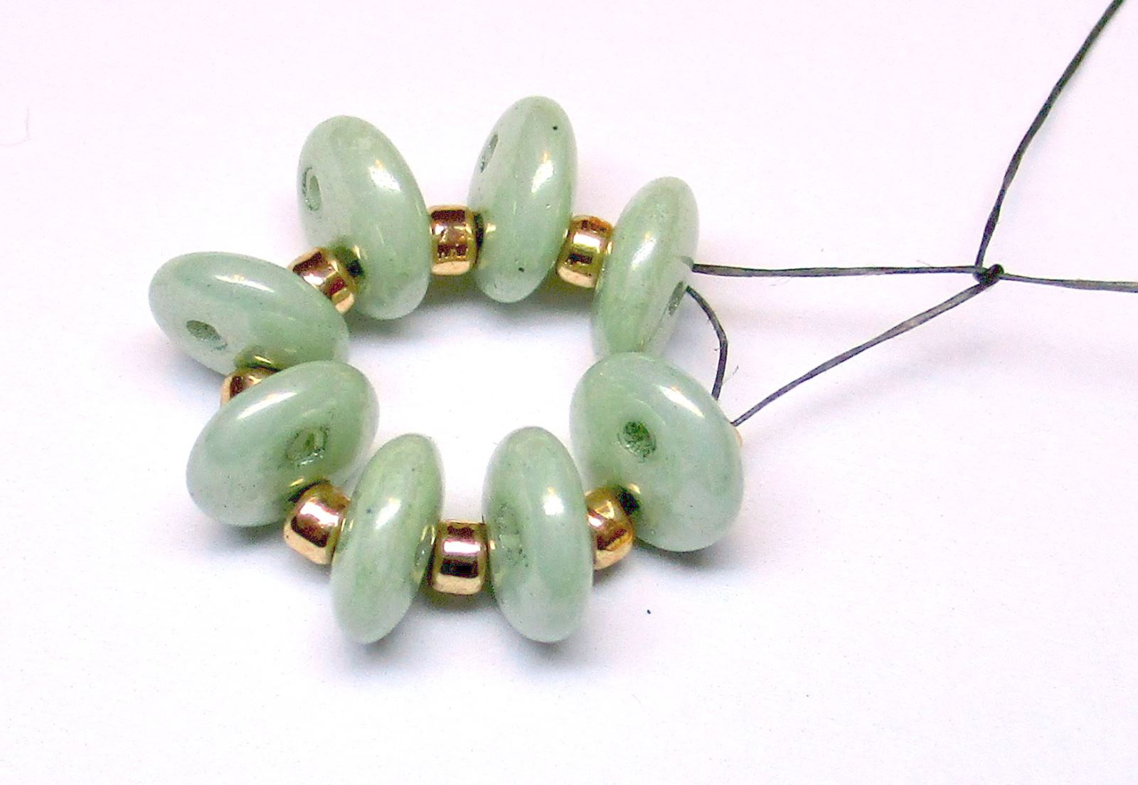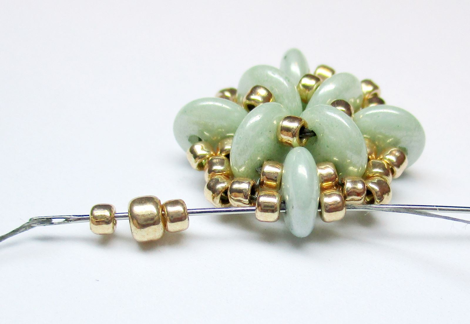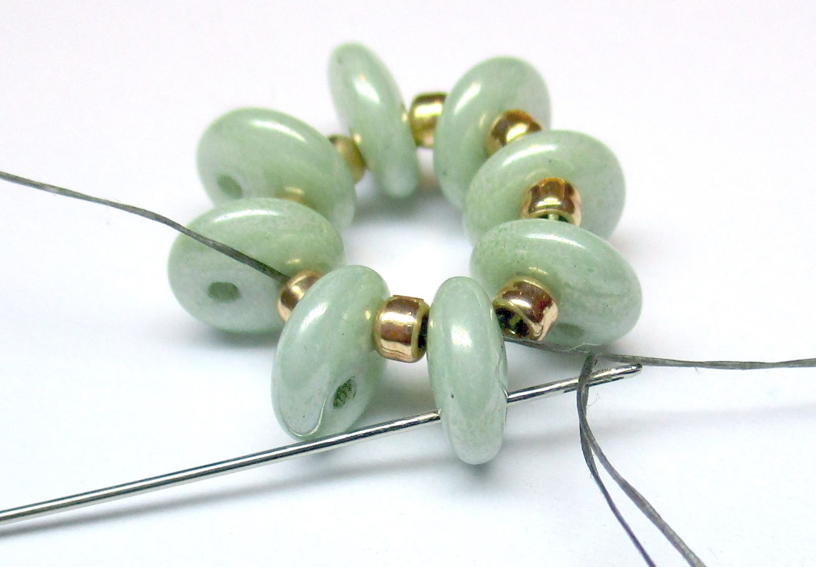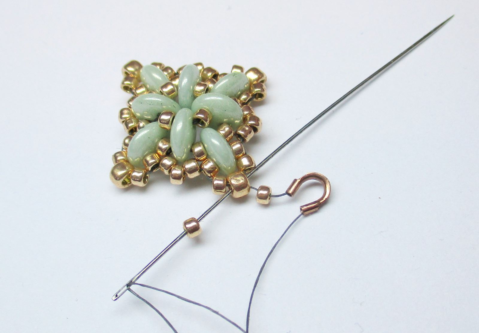 Fädeln Sie die Nadel wie auf dem Foto gezeigt durch die Perlen.
