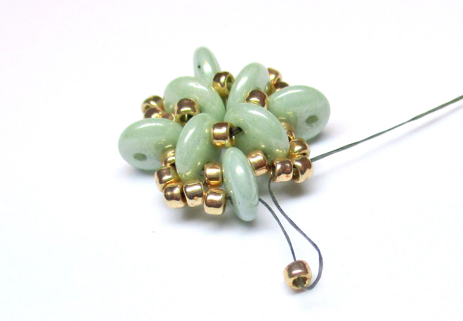 Wiederholen Sie Schritt 5 noch 3 Mal, indem Sie die Perlen zur Mitte des Motivs hin eindrehen und die Schlaufe festziehen. Nähen Sie anschließend die neu genähten Nähte erneut zusammen.