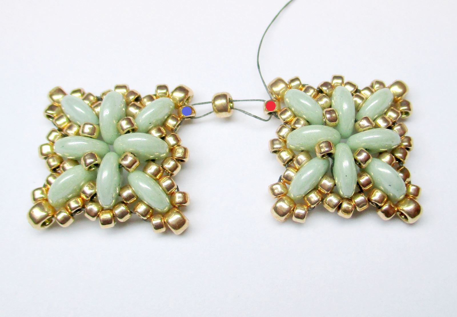 Nähen Sie ein weiteres Motiv nach der oben beschriebenen Vorgehensweise, jedoch ohne den Ärmel fertigzustellen. Fädeln Sie die Nadel durch die Perlen, beginnend bei der mit einem roten Punkt markierten Perle. Fädeln Sie 1xR11 ein und führen Sie die Nadel durch die mit einem blauen Punkt markierte Perle. Fädeln Sie die Nadel erneut durch die Perle R8 und dann durch die Startperle R11 (im Bild mit einem roten Punkt markiert). Vernähen Sie das Ganze anschließend noch einmal, um es zu verstärken.