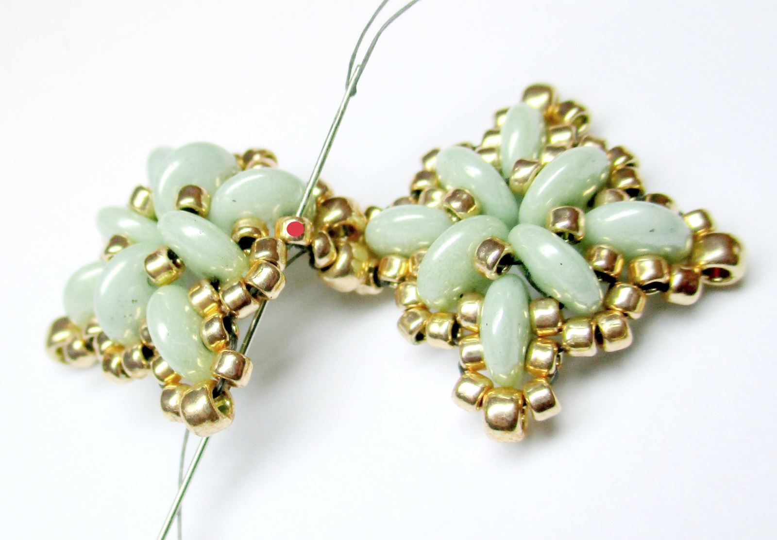 Fädeln Sie 1xR8 auf die Nadel und fädeln Sie die Nadel wie auf dem Foto gezeigt durch die Perlen. Die Startperle ist zur besseren Verständlichkeit mit einem roten Punkt markiert.