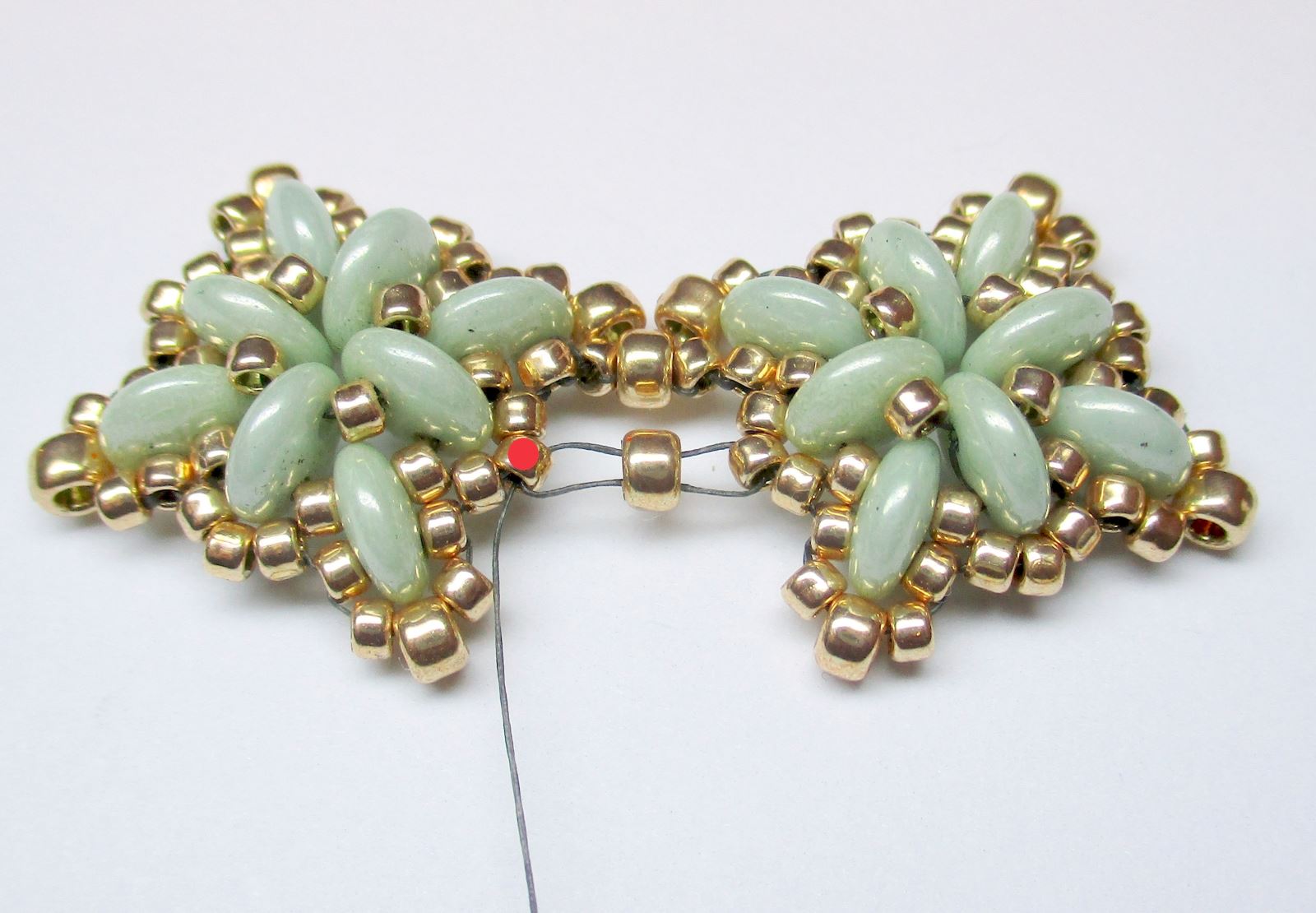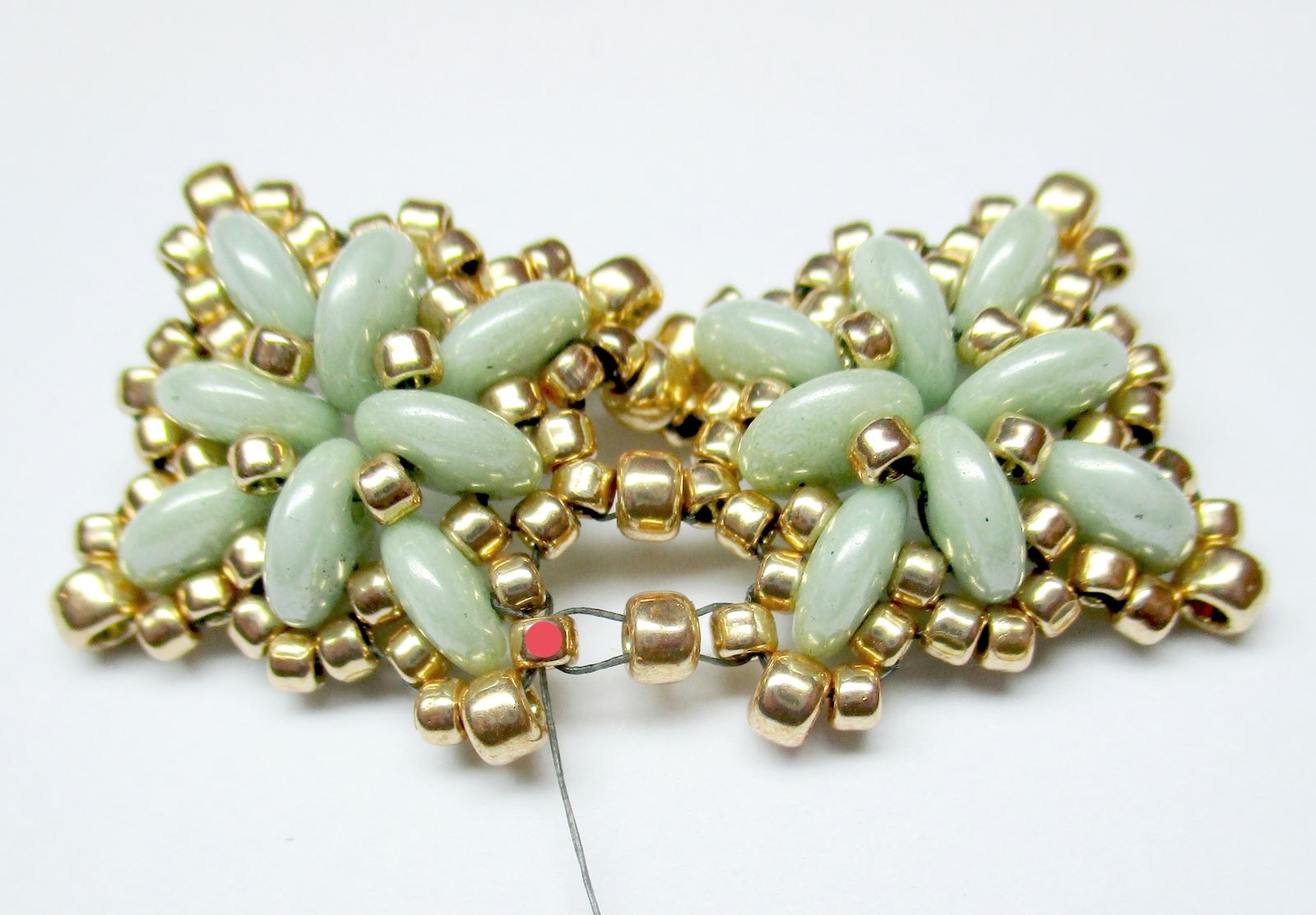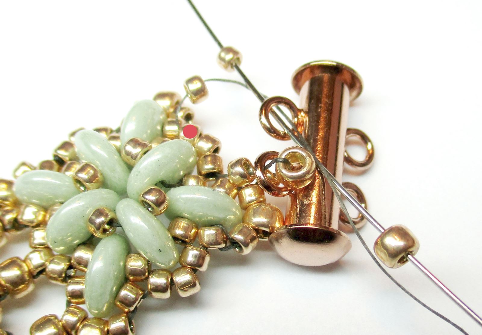 Nähen und verbinden Sie die benötigte Anzahl an Motiven gemäß der obigen Anleitung. Fädeln Sie die äußersten Teile nicht vollständig ein. Führen Sie die Nadel durch die Perlen, sodass sie aus der mit einem roten Punkt markierten Perle im Bild austritt. Fädeln Sie 1xR11 ein, führen Sie die Nadel durch die Öse am Verschluss, fädeln Sie R8 ein und führen Sie die Nadel erneut durch die Öse am Verschluss. Fädeln Sie 1xR11 ein und führen Sie die Nadel wie im Foto gezeigt durch die Perlen.