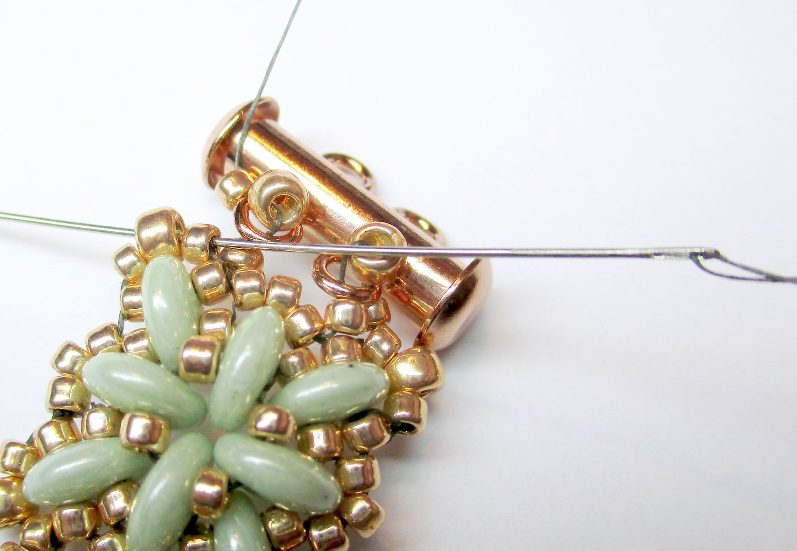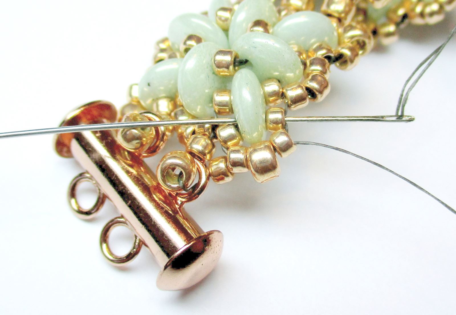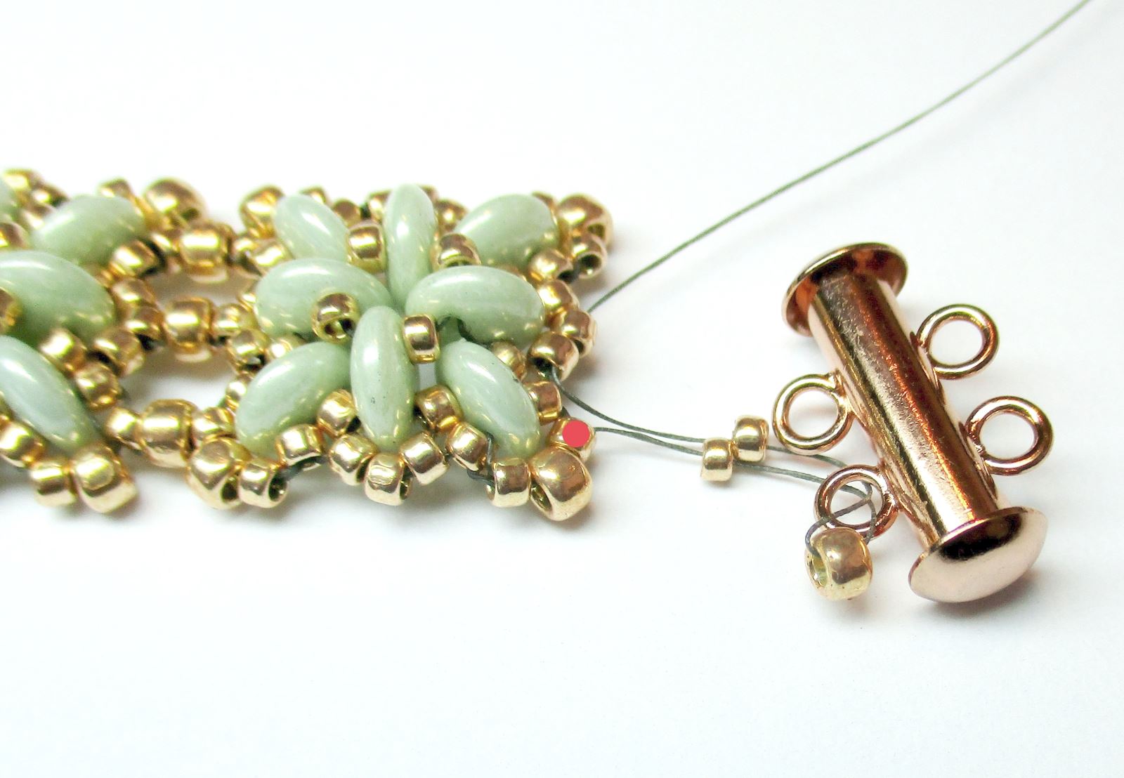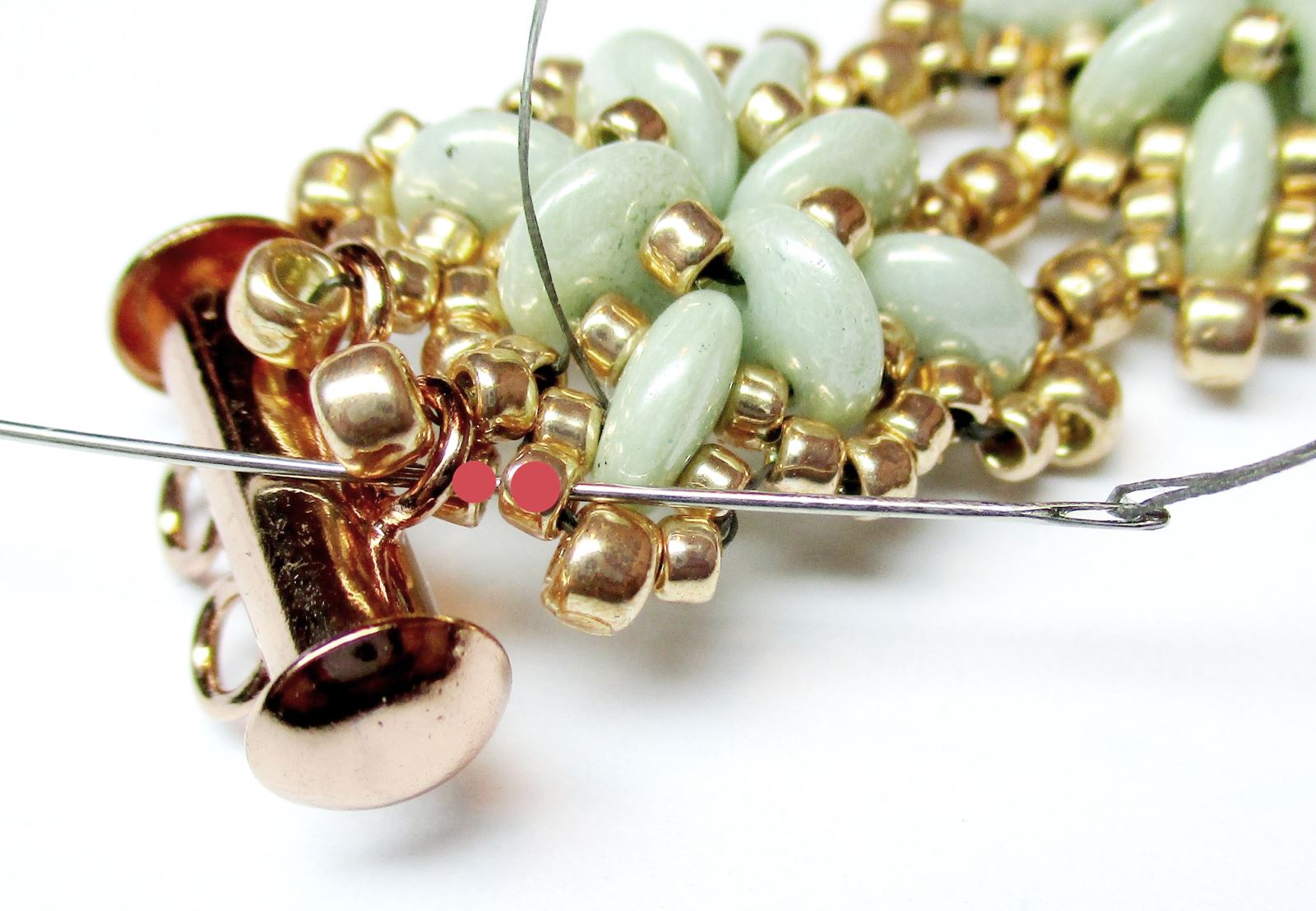 Fädeln Sie die Nadel durch die mit einem roten Punkt im Foto markierten R11-Perlen und nähen Sie dann durch alle bereits angenähten Perlen und vernähten Stellen im Verbindungsstück zwischen Armband und Verschluss.