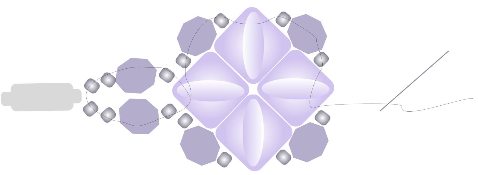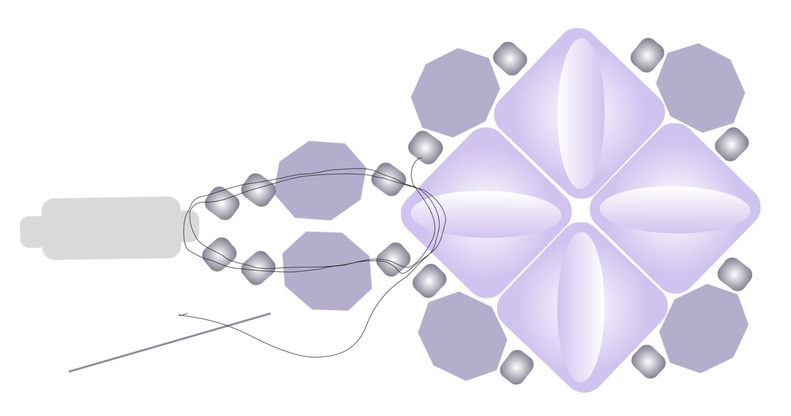 Jehlu postavte do polohy na obrázku. Nit se po prošití protáhne do mezery mezi korálky a obročí kolem rohu korálku. V této fázi je tedy viditelná na vnějším okraji výrobku, ale nemějte obavy, po našití dalších korálků se nit skryje.